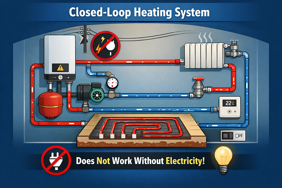 To understand how a closed-loop heating system works, imagine a heat transfer fluid continuously circulating within a sealed pipeline system. A heating system can generally be divided into the following components: • a heat generation unit; • a heat transfer and distribution system; • a diaphragm expansion tank; • end heat consumers; • monitoring and control equipment; • a pressure relief valve. Heat generators are typically boilers that operate on gas, oil, liquid, or solid fuels. These may also include instantaneous heaters, electric storage water heaters with centralized heating, district heating stations, and heat pumps. The heat transfer and distribution system consists of pipelines, distribution units, storage tanks, and a circulation pump. The pump capacity must be calculated based on the total system resistance. Building height is not taken into account, since the water pumped into the supply line returns through the return line. The diaphragm expansion tank is designed to compensate for changes in the volume of the heat transfer fluid as temperature varies. Its primary function is to maintain stable system pressure. Heat consumers are heat-emitting surfaces located within heated spaces, such as radiators, fan coils, heating panels, and underfloor heating systems. Thermal energy flows from areas of higher temperature to lower temperature. The greater the temperature difference, the more intense the heat transfer. Heat transfer in a heating system occurs through three physical processes: • conduction; • convection; • radiation. In today’s world, no technical system can function efficiently without proper automation. Modern heating systems include control units that ensure reliable and uninterrupted operation without constant supervision. The simplest example is a thermostatic radiator valve, which maintains a stable indoor temperature. Modern boilers and pumps are equipped with mechanical, electrical, and electronic control systems.